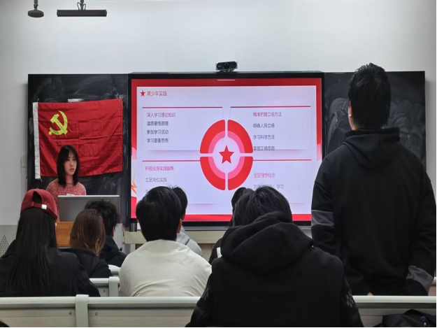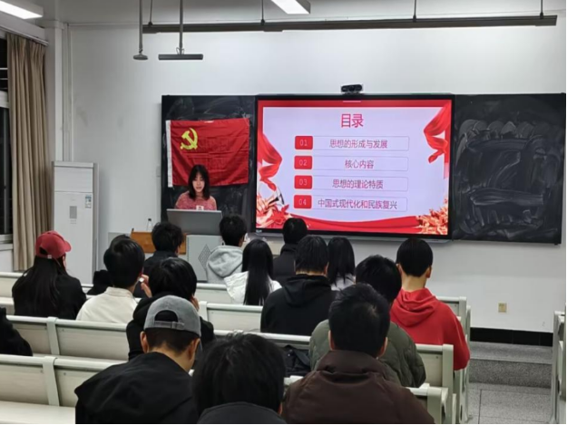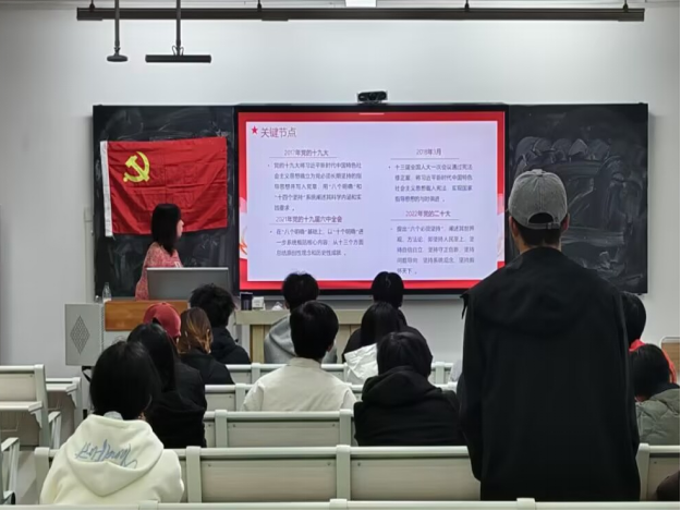 首先开篇以“习近平主席讲话视频”为切入点,引起同学们注意力,调动现场热烈气氛,带领在场学子进入学习状态。其次主讲人以“新思想引领新时代改革开放”介绍“习近平新时代中国特色社会主义思想”的形成背景,深入阐述了为什么会形成这样的思想。随后以“党的十八大”到“党的二十大”详细介绍了八个关键节点,让学子更加清晰的了解“习思想”的发展历程。