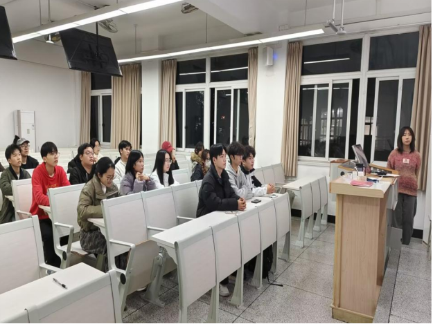 (图为主讲人与同学们观看视频学习)