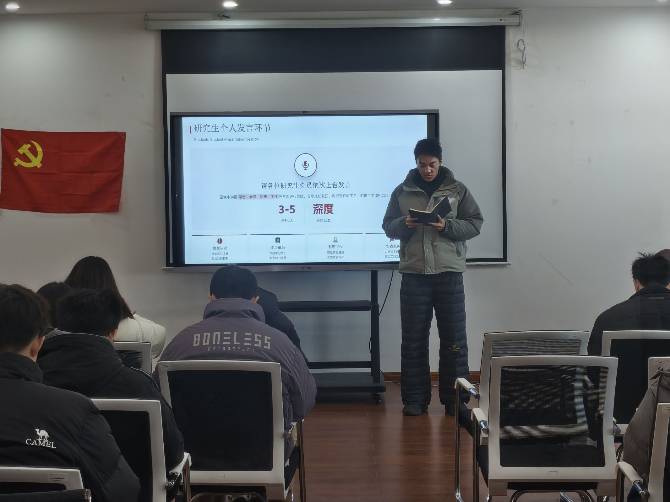 活动第二项,由各位党员同志上台对自己本年度的学习和工作作出总结,年度总结不仅可以更好的回顾一年中自己的收获和遗憾,也可以为新的一年的年度目标作出更清晰的规划,祝海韬同志在总结中提到:成为预备党员之后,我感觉自己肩负重任,在日常的生活中,我都会时刻想起自己的身份,在学习和工作中都会以更高的标准要求自己,希望可以给身边的同学树立起良好的模范带头形象。