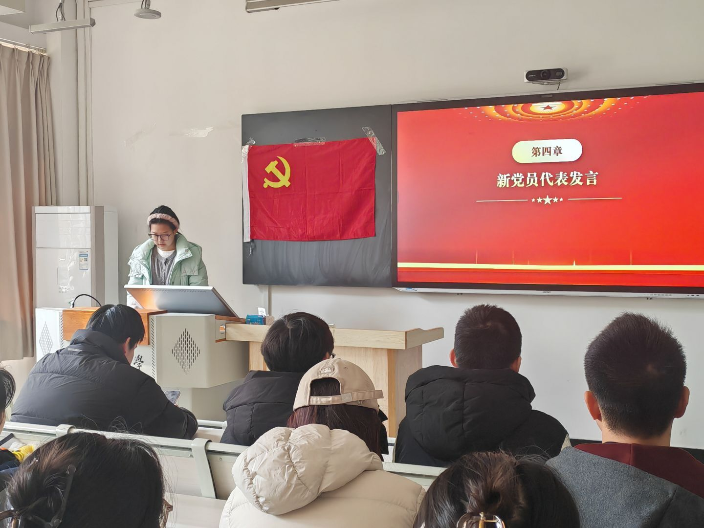 宣誓完毕后,新党员代表周小楠同志上台发言。她结合自身成长经历和学习体会,表达了加入党组织的激动心情与崇高使命感,承诺将以党员标准严格要求自己,努力学习、积极工作,在实践中锤炼党性,不负组织的信任与培养。
