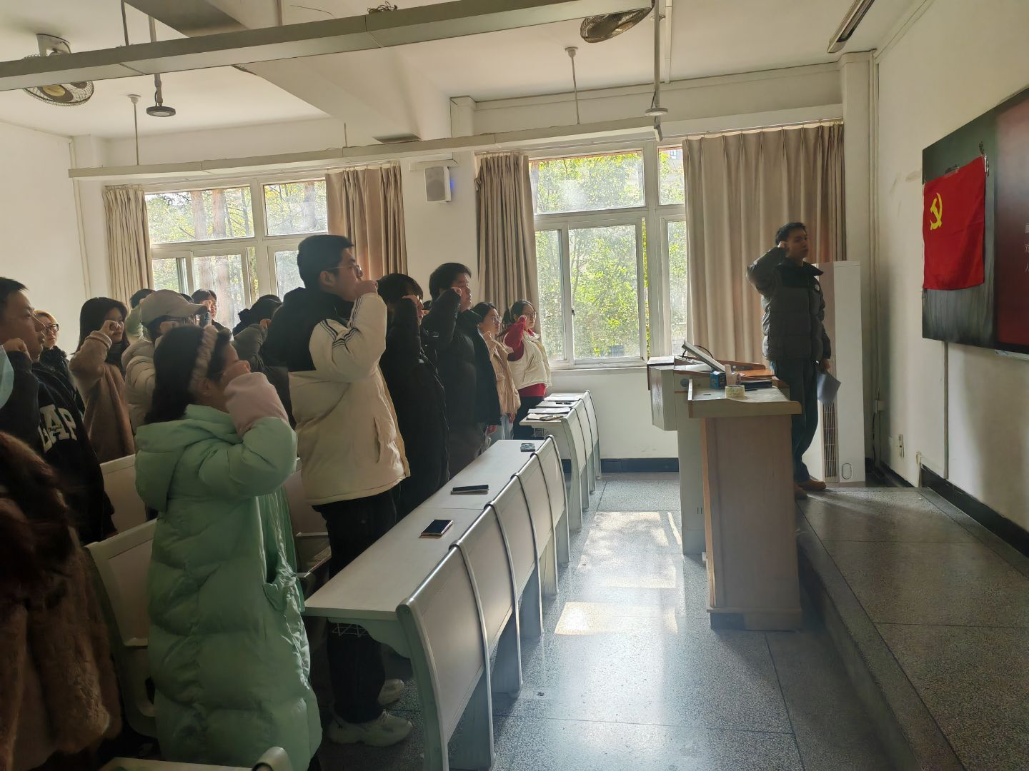 宣誓环节将仪式推向高潮。全体新党员面向鲜红的党旗,举起右拳,庄严宣誓:“我志愿加入中国共产党,拥护党的纲领,遵守党的章程,履行党员义务,执行党的决定,严守党的纪律,保守党的秘密,对党忠诚,积极工作,为共产主义奋斗终身,随时准备为党和人民牺牲一切,永不叛党。”铿锵有力的誓言在教室内回荡,表达了新党员对党的无限忠诚与为共产主义事业奋斗终身的坚定决心。