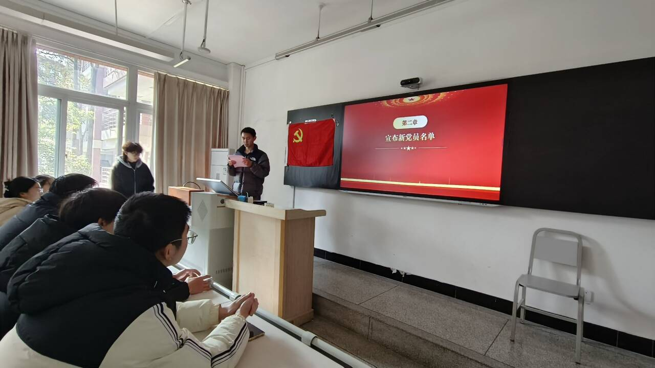 仪式在雄壮的《国际歌》声中拉开序幕。随后,主持人宣读了党委关于批准夏嘉欣等13名同志加入中国共产党的通知,他们的预备期自2025年12月12日起至2026年12月12日止。在热烈的掌声中,新党员名单被一一宣读:夏嘉欣、周小楠、范才彬、李清清、李天阳、毛涵楚、闫佳乐、别佳洁、刘莉、钟婷婷、毛艺茹、赵炎卓、李欣睿,这13名同志经过组织的培养与考察,光荣地成为中国共产党预备党员。