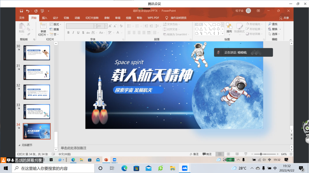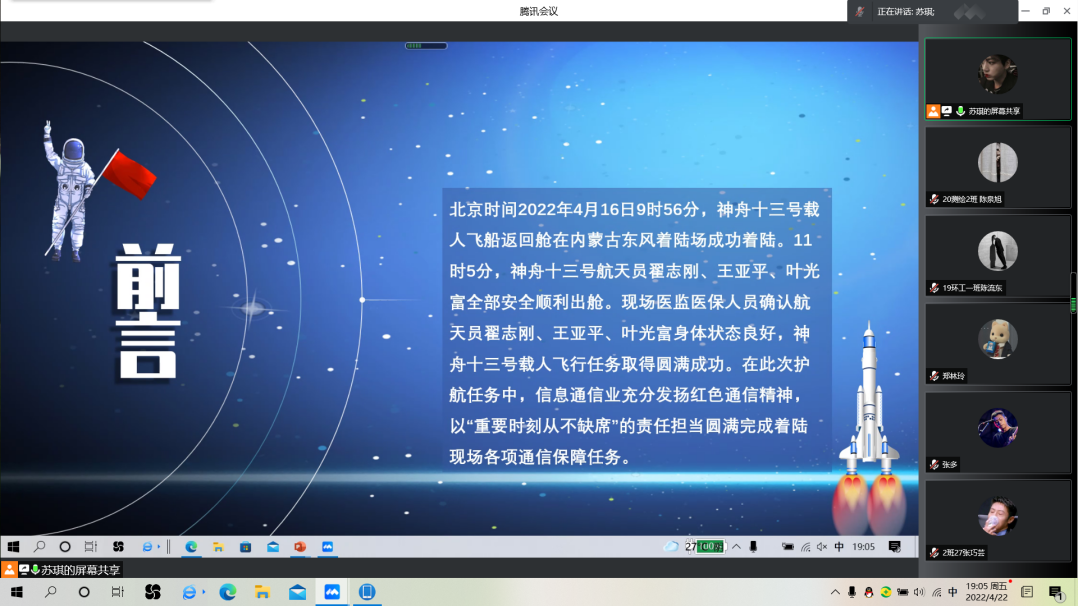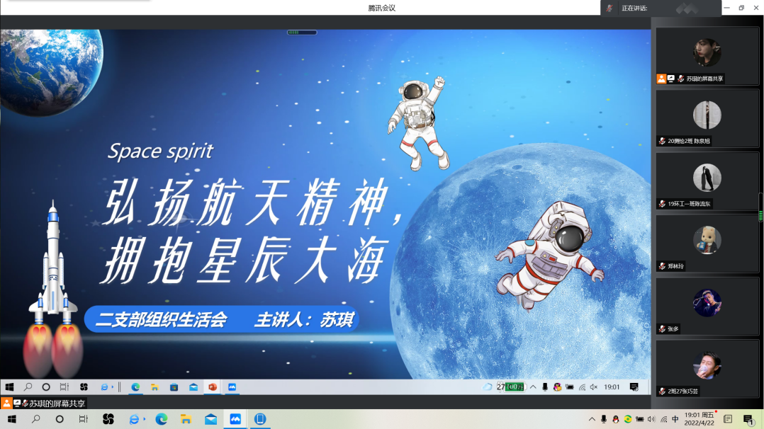 学生第二党支部于腾讯会议召开以“弘扬航天精神,拥抱星辰大海”为主题的四月组织生活会。此次组织生活会由苏琪同志主持。学生第二党支部22名党员参会,其中正式党员6名,学生第二党支部书记舒愉棉老师参加了此次组织生活会。