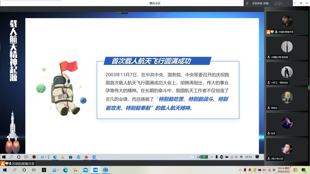 自1970年4月24日中国第一颗人造地球卫星东方红一号发射成功已有52年,这52年,充斥着中国航天人的血与泪,铸造了伟大的中国载人航天精神。载人航天精神是中国共产党人精神谱系的伟大精神之一,深入贯彻落实载人航天精神,对党员的党性修养的提升有重要意义。会议带领着与会党员就载人航天精神的起源、内涵、意义以及如何弘扬载人航天精神做了相应介绍。经历52年的风雨洗涤,载人航天精神浓缩为:特别能吃苦,特别能战斗,特别能攻关,特别能奉献。也成为了民族精神的宝贵财富。2016年,为纪念中国航天事业成就,发扬中国航天精神,每年4月24日被设立为“中国航天日”。首个中国航天日以“中国梦,航天梦”为主题;2020年中国航天日的主题就是“弘扬航天精神,拥抱星辰大海”;今年,我们的主题为“航天点亮梦想”。自古以来,无论是嫦娥奔月,夸父逐日,还是万户飞天,中华民族都对太空充满了想象。如今,中国人民也正在为实现自己的太空梦逐步努力。