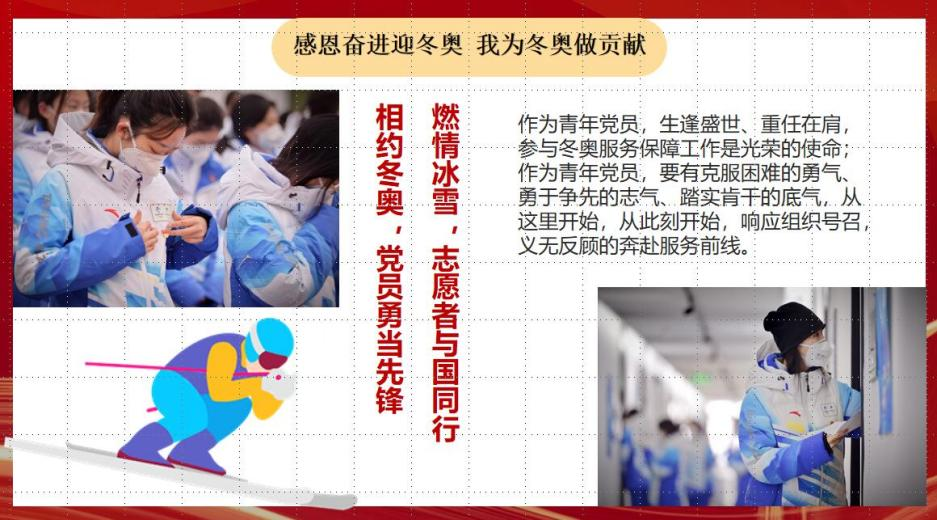 李卓同志讲到“一起向未来”,北京冬奥主题口号振奋人心,展现了全世界对共创美好未来的期待。中国有决心、有底气兑现承诺,在奥林匹克运动发展史上留下浓墨重彩的一笔。最后也提及北京冬奥会惊艳的开幕式和开赛以来中国代表团的优异表现,点燃了大众的冰雪热情。而精彩纷呈的冬奥会背后缺少不了基层各级党组织和党员的辛勤付出以及青年志愿者们的行动。他们同样值得我们关注与学习。