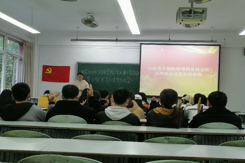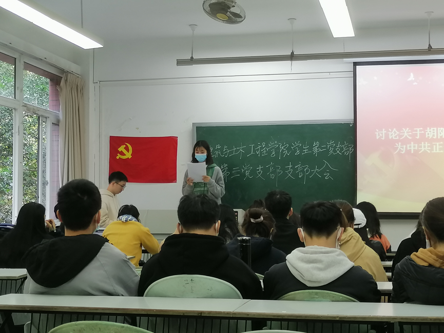 学生第三党支部关于讨论胡阳烊等四位同志转为中共正式党员的议程在5111顺利召开。出席本次党员大会的人员有学生第三党支部书记孙也椒同志及25名学生党员,其中正式党员2名(包括支部书记),杨昱嘉同志担任本次支部大会的主持人。