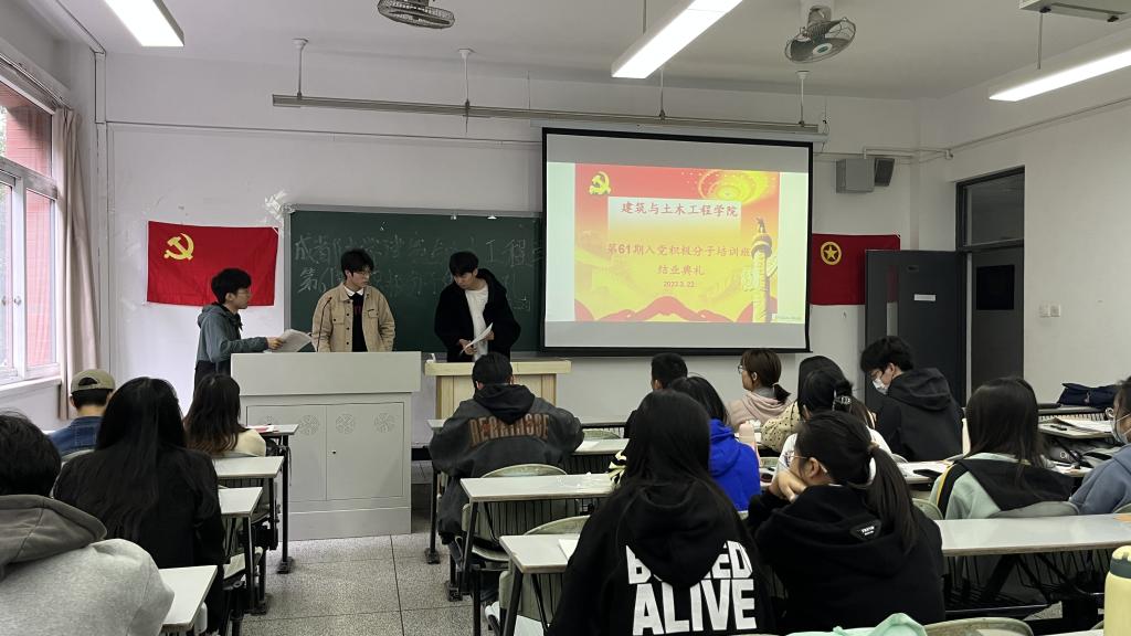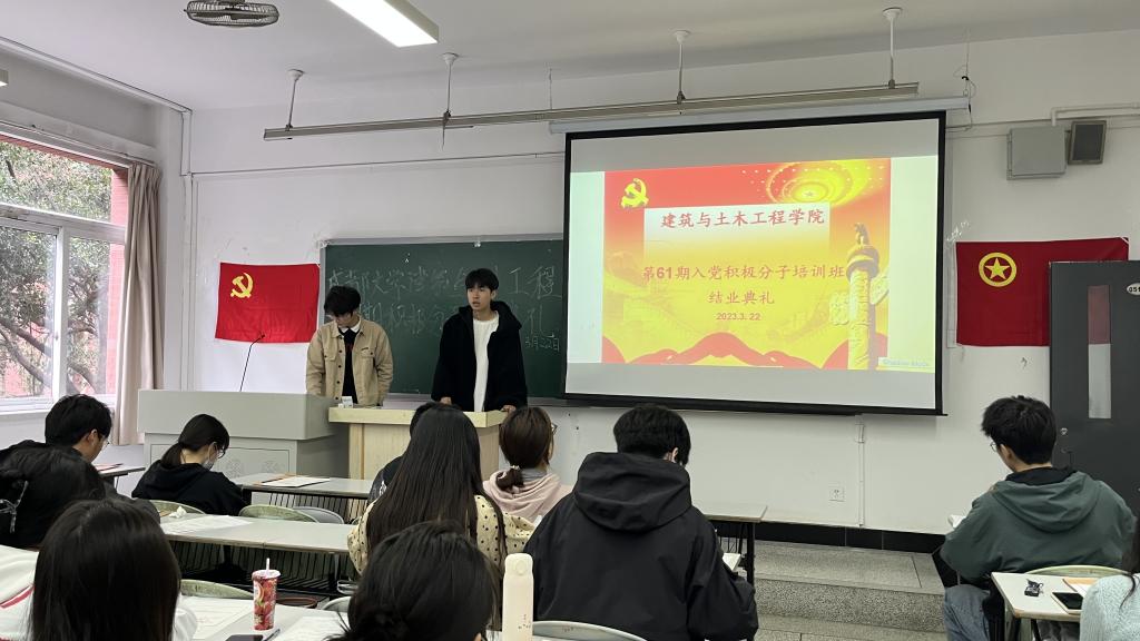 第61期入党积极分子培训班结业典礼于5111教室举行。组织部负责人周旭涛,党员先锋队负责人陈泉旭以及入党积极分子培训班全体学员参加了结业典礼。本次结业典礼由周旭涛主持。