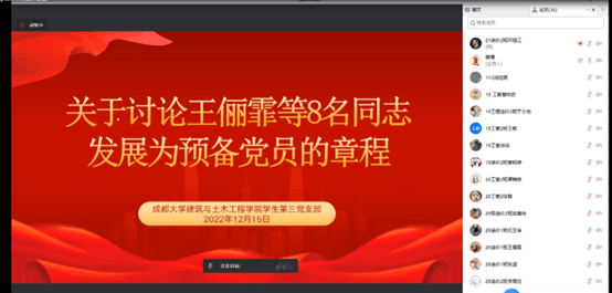 学生第三党支部在线上召开并讨论关于王俪霏等八名同志发展为预备党员的章程的支部党员大会。本次会议由谢湘同志主持。学生第三党支部书记孙也椒老师参加了本次支部党员大会。