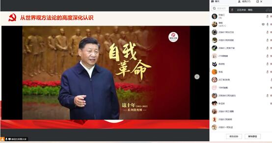 会议临近结尾,全体党员同志观看《自我革命》纪录片,一项项科研技术突破,一个个世界难题攻破,都代表这中华民族的自我革命,自我创新的精神。中国共产党坚持运用辩证唯物主义和历史唯物主义,不忘初心,才能正确回答时代和实践提出的重大问题,走得更稳,行得更远。