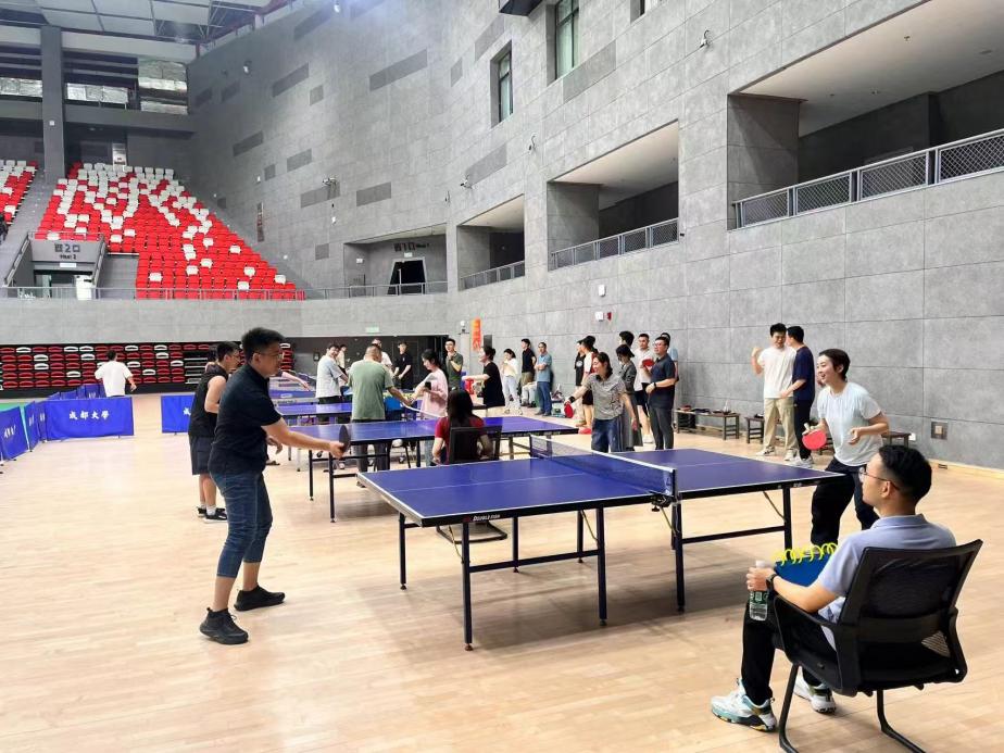 工会策划筹备的首届教职工乒乓球赛在成都大学体育馆开赛,18 名教职工参与单打、双打角逐,赛场助威声阵阵,气氛热烈。