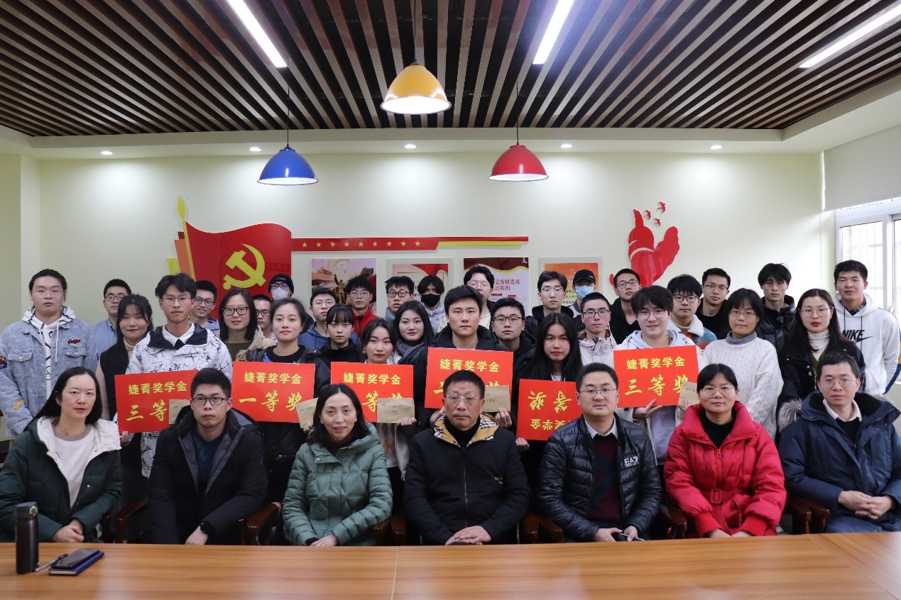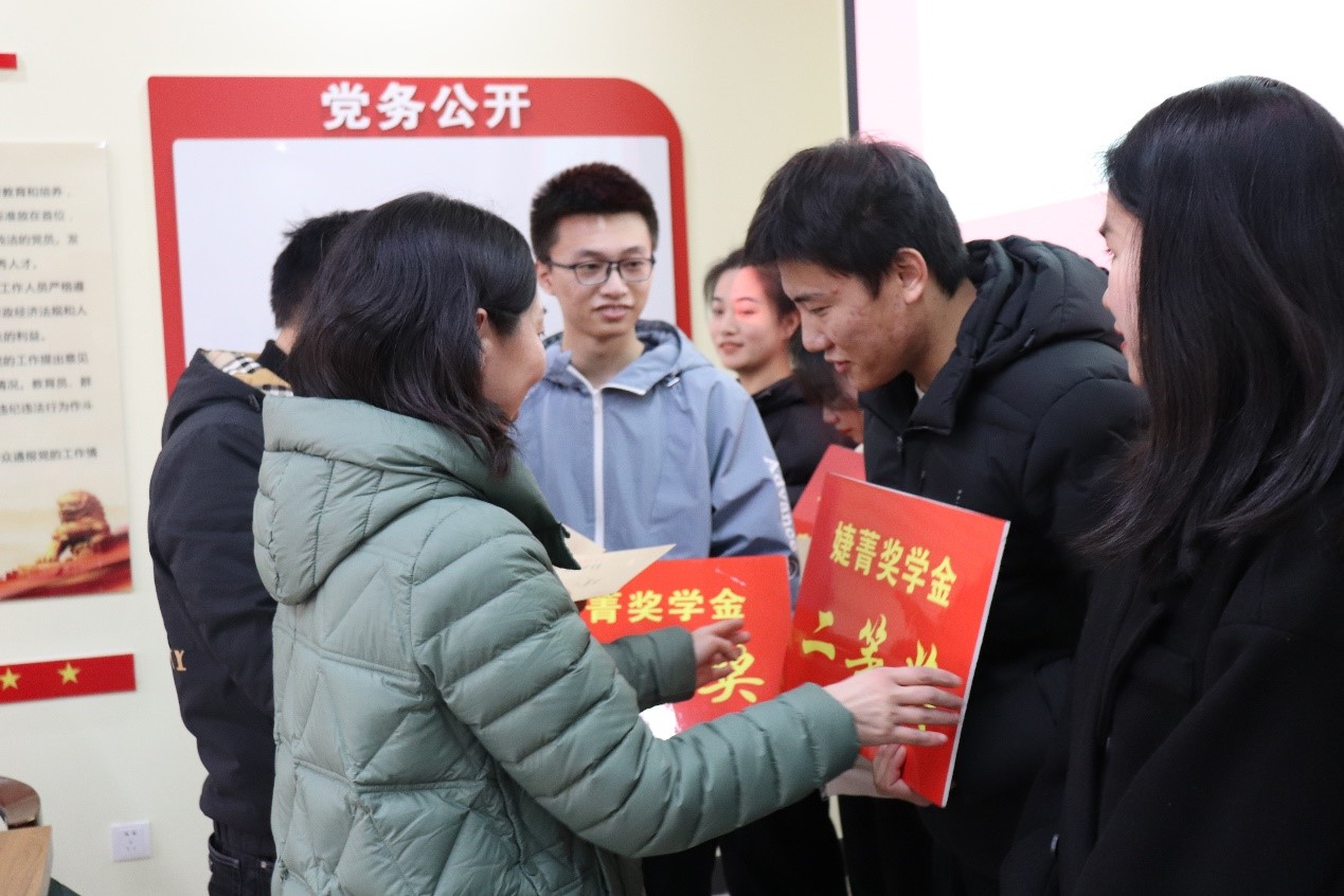 学院院长吴启红宣读获奖名单,学院书记黄进教授和万世明副教授为高潇等六名同学颁发了“婕菁奖学金”一、二、三等奖。