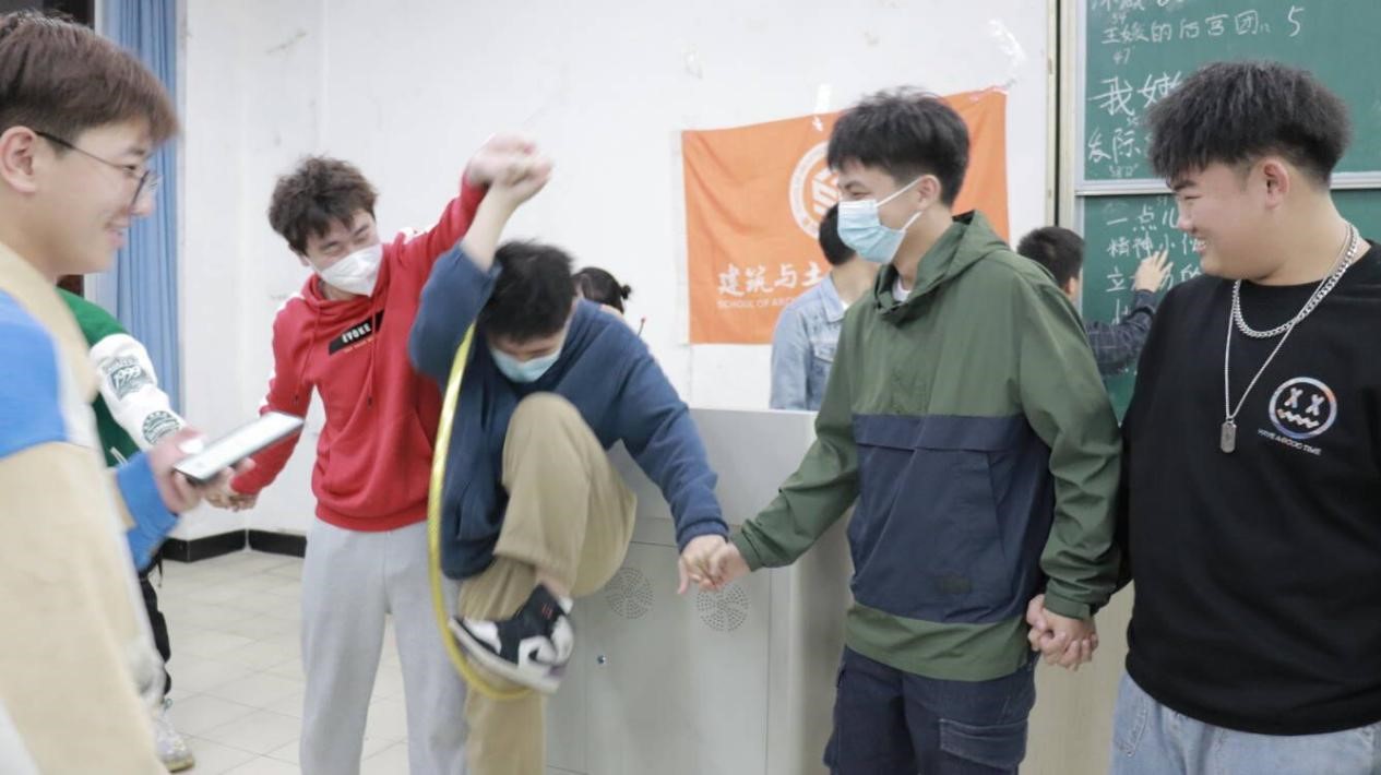 紧接着是第二个活动:传呼啦圈。每个队伍先由一位同学转十圈呼啦圈,所有队员手拉手,将呼啦圈依次从第一个人的传到最后一个人,用时最短则获胜。每个队伍利用自己的柔韧性依次穿过小呼拉圈,尽最大的努力争取胜利,为我们展现了各种“太极姿势”,使台下笑声连连。