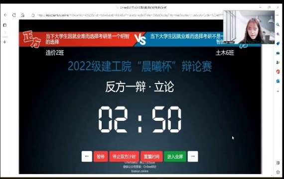 12月7日,成都大学2022级建工院“晨曦杯“辩论赛半决赛于线上圆满举行。来自造价二班与土木六班的两支队伍分别作为正方与反方就“当下大学生因就业难而选择考研是一个明智的选择或不是一个明智的选择”这一辩题展开激烈的角逐。