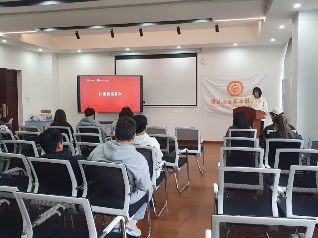协社团换届答辩于建工楼三楼报告厅举行,本次社团换届答辩由社联部干事黄晨曦主持。分管社联的主席梁滔,社联部部长漆湘,钟珊为此次活动嘉宾。BIM协会会长余飞洋,结构协会副会李雨欣,建研社会长杨镇宇,足迹协会会长谢雪梅担任此次答辩的评委。