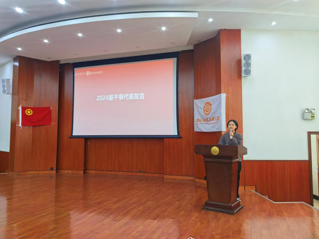 大会第四项议程,由何渝佳代表新一届团学组织成员发言。她总结了自己近两月团学组织的生活点滴及工作心得体会。她表示,在团学组织这个大家庭里,希望每一位成员都能够坚定目标,不气馁,不放弃,抵达属于自己的梦之彼岸。