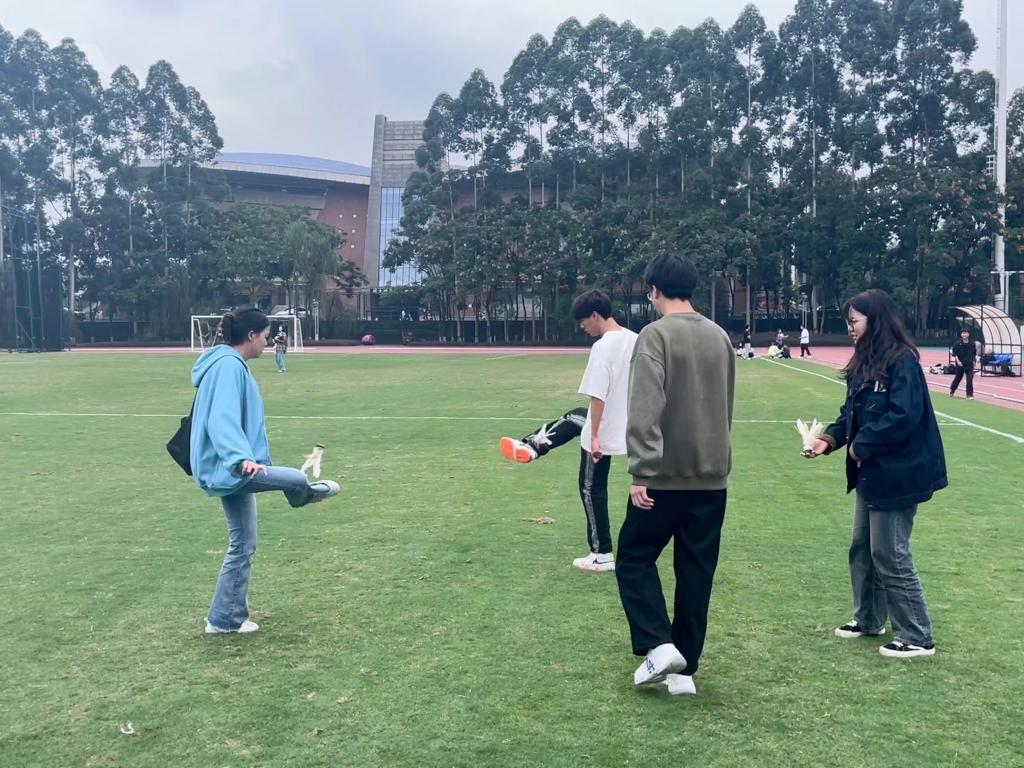 首先展开的是比赛的第一关“毽步如飞”,顾名思义,第一关考验同学们踢毽子的水平能力。同学们熟练地踢着毽子,摆出各种各样的姿势,欢乐无比,笑声不断。