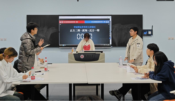 首先,辩论双方进行自我介绍,介绍完毕后激动人心的辩论赛正式开始。赛场气氛紧张,双方辩手纷争不断、侃侃而谈,场下观众激情澎湃、掌声连连。双方辩论队旁征博引,相互间进行着激烈的角逐。