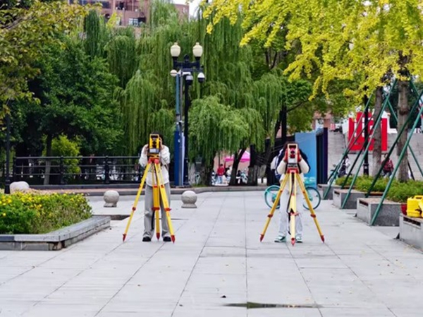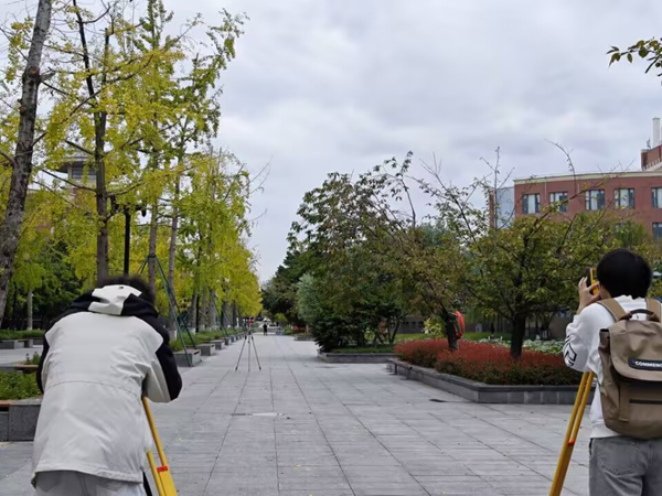 随后正式开始测绘比赛。参赛选手在张澜大道选取点位并使用全站仪进行测量。在比赛过程中,各组的参赛人员积极投入到比赛中,组员之间相互配合,认真完成自己的任务。