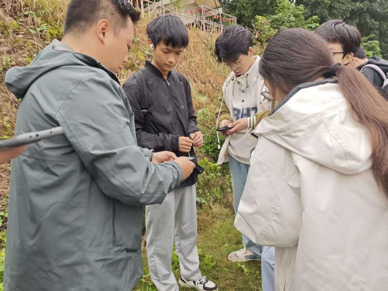 此外,指导老师详细讲解了地质罗盘的使用方法,深入浅出地介绍罗盘的各个部件及其功能,阐述了在实际操作中需要注意的事项,并为大家进行了示范,然后让同学们分组使用罗盘仪测量岩层产状(走向、倾向、倾角),记录地层厚度与岩性特征,并在实习手册上绘制地质剖面图。
