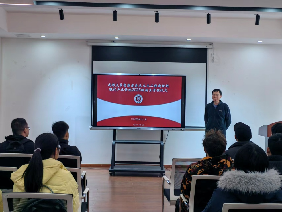 12月9日,成都大学智能建造及土木工程新材料现代产业学院(以下简称“现代产业学院”)2025级新生开班仪式在建筑工程学院S3306会议室顺利举行。学院理事会理事、土木工程系主任杨华平,现代产业学院专业负责人龙立,2024级学生代表以及全体2025级新生共同出席。仪式由龙立主持。
