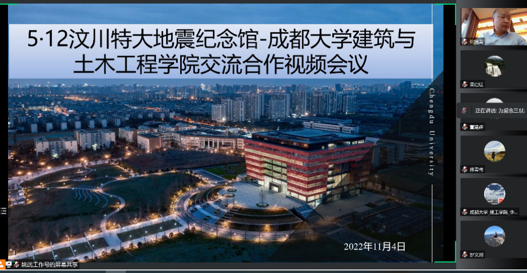 2022年11月4日上午10点,学院与5·12汶川特大地震纪念馆进行了视频会议。会议主题为围绕5·12汶川特大地震相关遗址保护开展科学研究。会议由梁辉明副馆长主持,纪念馆何瑞雪馆长和学院院长吴启红教授出席并参加了会议。