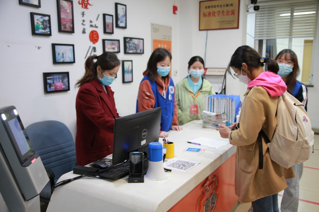 师生等候在新生寝室楼栋门口,以饱满的热情和周到的服务,帮助和引导新生完成一系列报到手续,顺利入住寝室。
