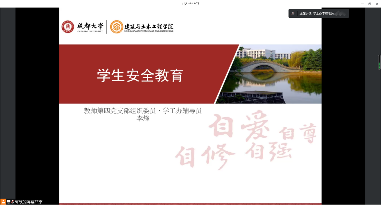 最后李烽老师进行学生安全教育。对大学生活中各个场景容易发生的安全隐患做了相应的提醒。同时介绍了征兵入伍政策,鼓励有志于此的同学积极应征入伍。