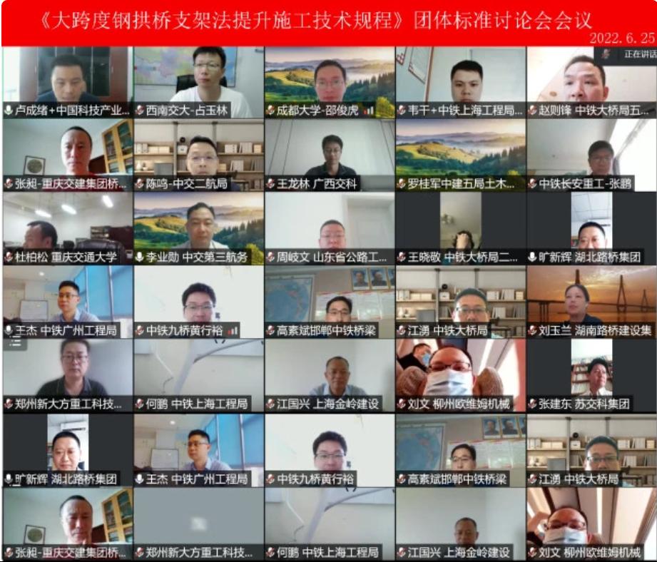 2022年6月25日,由中国科技产业化促进会组织,中铁上海工程局集团第五工程有限公司、西南交通大学、成都大学、柳州欧维姆机械股份有限公司等单位联合提出起草的《大跨度钢拱桥支架法提升施工技术规程》团体标准研讨会通过线上会议的形式召开。会议邀请湖州时代建筑设计有限公司、中铁四局集团第五工程有限公司、黄河勘测规划设计研究院有限公司、安徽省公路桥梁工程有限公司、中交路桥华南工程有限公司、广西交科集团有限公司、中铁三局集团有限公司、山东省路桥集团有限公司、中建三局集团有限公司、中铁长江交通设计集团有限公司、中铁大桥局集团有限公司、中交公路规划设计院有限公司、中铁九桥工程有限公司、湖北省路桥集团有限公司、重庆交通建设(集团)有限责任公司等60多家单位的技术专家参与讨论研究,优胜客