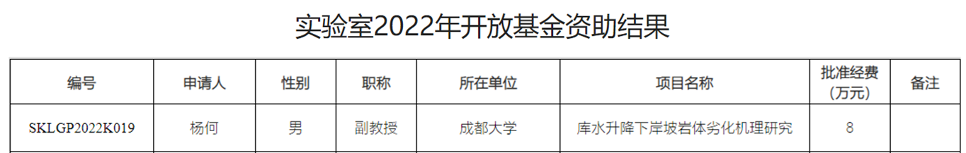 工程管理系教师杨何博士主持的《库水升降下岸坡岩体劣化机理研究》项目获地质灾害防治与地质环境保护国家重点实验室(成都理工大学)2022年开放基金项目立项(省部级项目)。