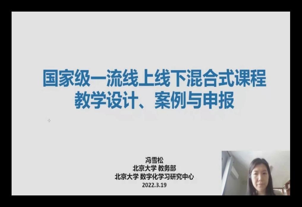 老师们观看了由本北京大学教务部教学办副主任冯雪松关于“一流课程设计、案例与申报”的精彩线上讲座。该讲座分别从一流本科课程建设理念、混合式课程案例分享、混合式课程教学设计、线上线下混合式一流课程评审政策及申报重点、一流本科课程申报附件材料的准备、一流课程说课视频共计六个部分对线上线下混合式课程教学设计和申报进行了系统详细的讲解。