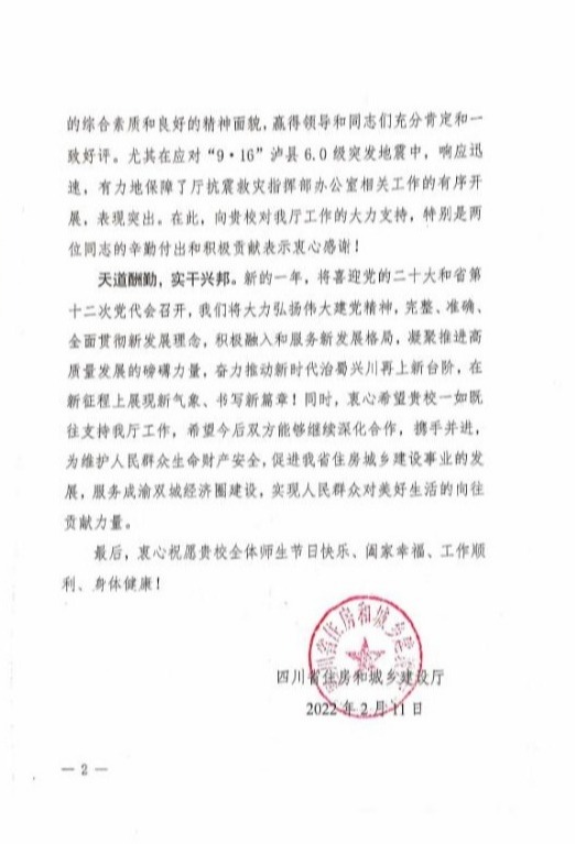 近日,我校收到四川省住房和城乡建设厅发来的感谢信。信中提到优胜客