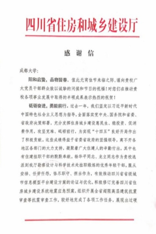 选派的杨华平、龙立两位博士教师,在四川省住建厅勘察设计与科学技术处挂职锻炼期间,服从安排、任劳任怨、恪尽职守、担当作为,较好地完成了各项工作任务,展现出了过硬的综合素质和良好的精神面貌,尤其是在应对“9.16”泸县6.0级突发地震中,响应迅速,有力地保障了住建厅抗震救灾指挥部办公室相关工作的有序开展,表现突出,获得了全厅同志的一致认可,向我校的大力支持和两位老师的辛勤付出、积极贡献表达了衷心的感谢!