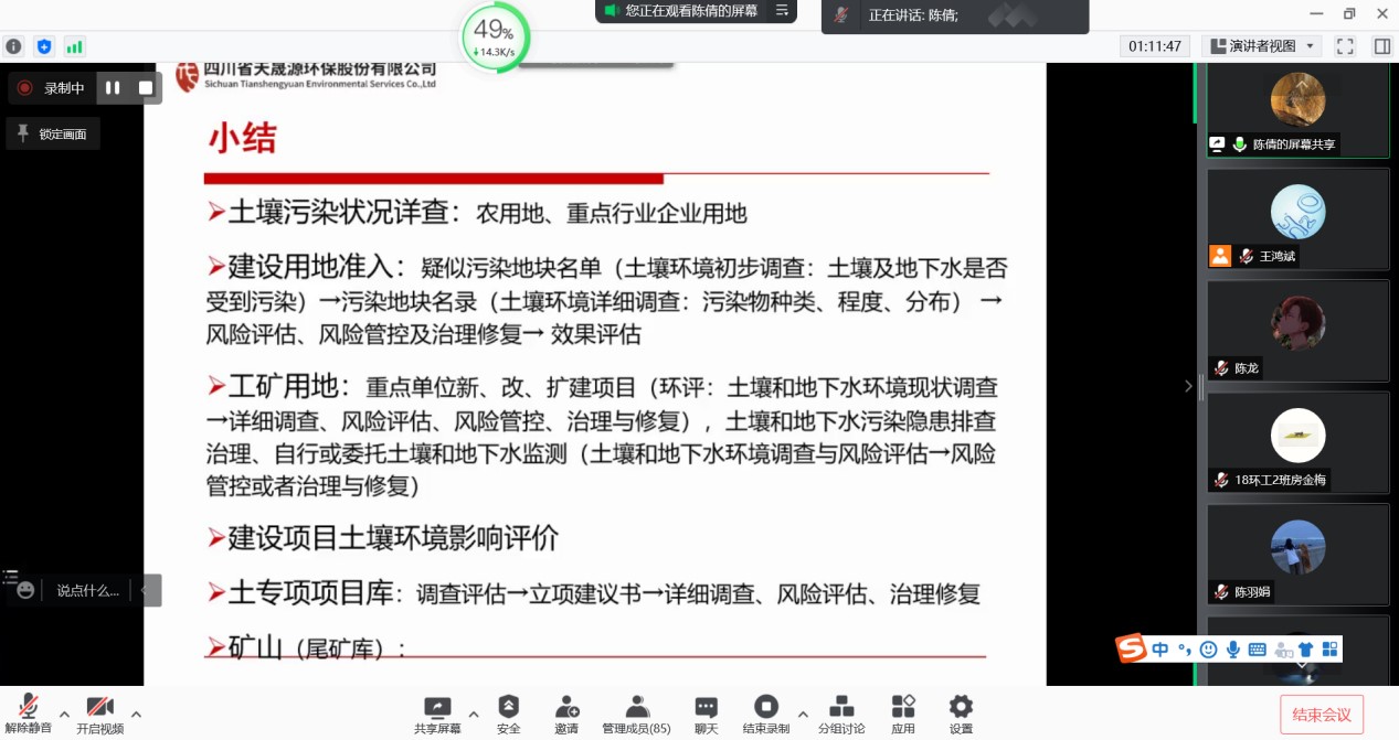 本次讲座邀请了四川省天晟源环保股份有限公司总工程师陈倩教授及高工,以腾讯视频会议形式开展,讲座主题为《技术人员快速成长路径分享-以土壤环境调查评估修复为例》。会议由环工系组织,学院副院长董建辉主持,各年级优秀学生参加。