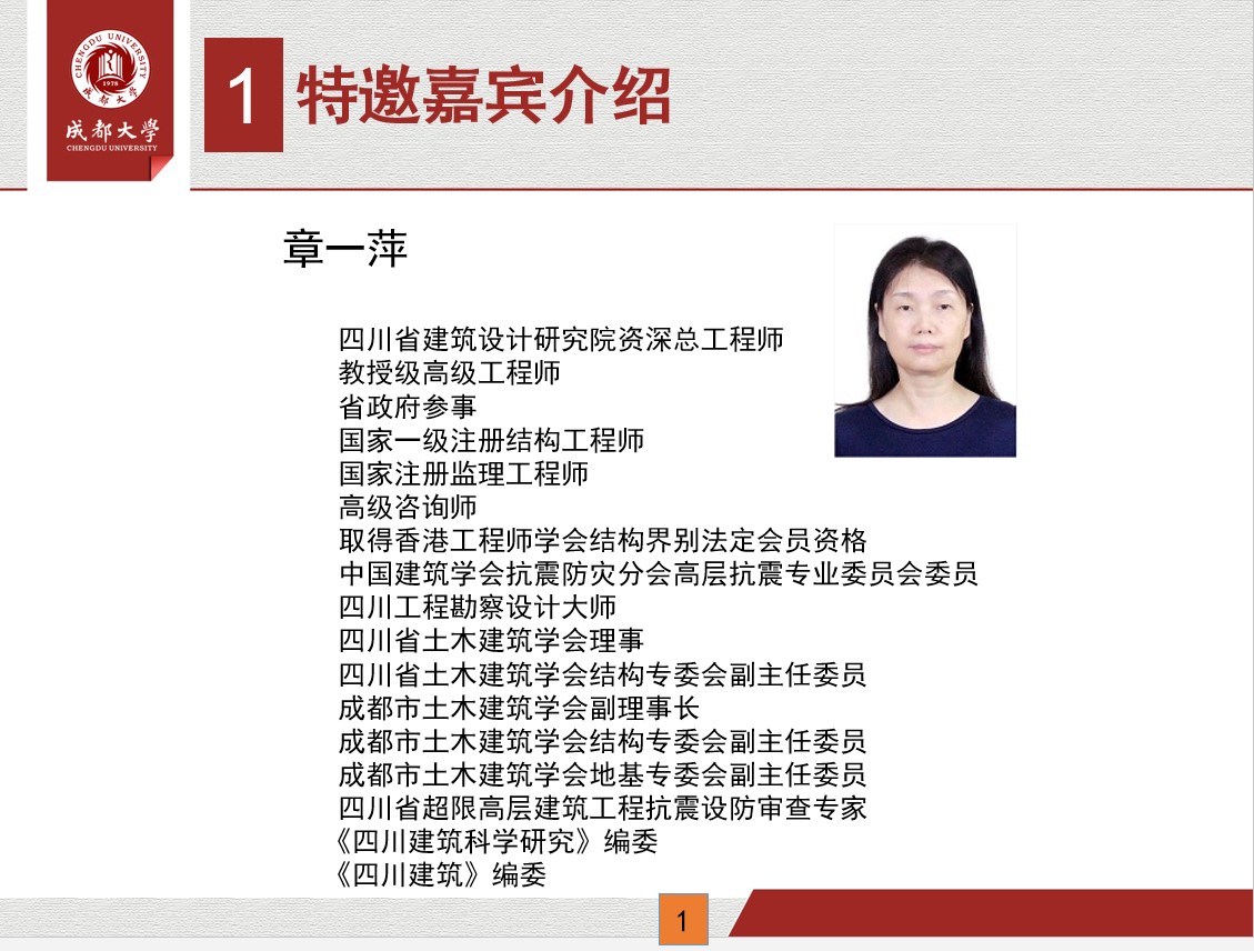 特邀四川省建筑设计研究院资深总工程师、教授级高级工程师、四川省工程勘察设计大师、四川省人民政府参事章一萍女士参加。讲座由系主任杨华平博士主持,董建辉副院长以及关惠平教授等多位土木工程系专任教师出席。