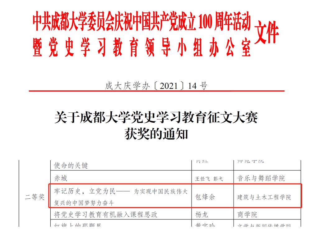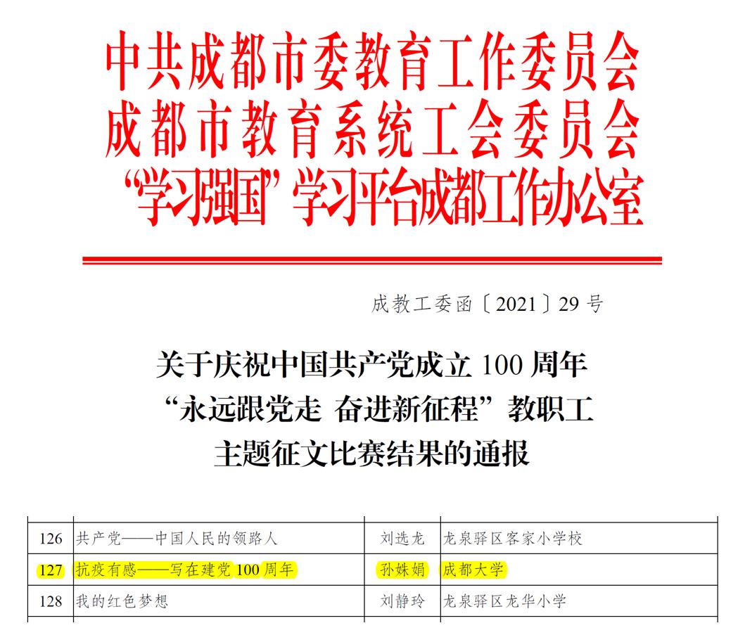为歌颂中国共产党百年伟大历程的辉煌成就,继承和发扬党的光荣传统和优良作风,激励广大党员干部在新时代牢记初心使命,展现新气象、新担当和新作为,2021年6月-7月,成都市教育工委、成都市教育系统工会委员会、“学习强国”学习平台成都工作办公室组织举办了“永远跟党走 奋进新征程”教职工主题征文比赛;成都大学举办了党史学习教育征文大赛。