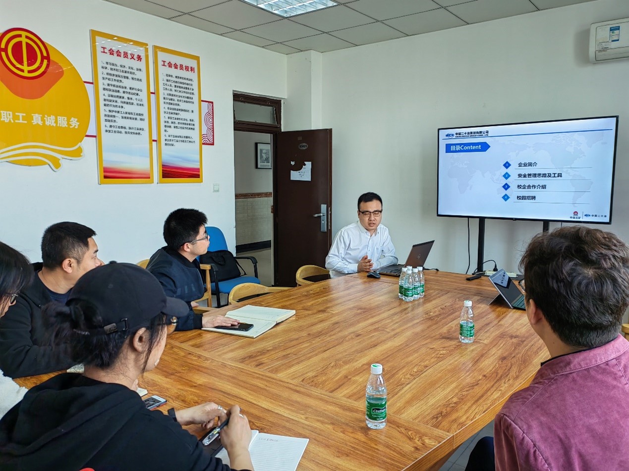 郝杰介绍了二十冶集团公司业务和国内外的布局情况,从安全文化核心价值观、安全理念、安全管理总体思路和安全智慧平台等方面阐述了集团在安全方面所做的工作。他对集团人才需求、员工晋升体系和薪酬待遇等进行了讲解,着重介绍了集团在产学研合作交流方面的进展。