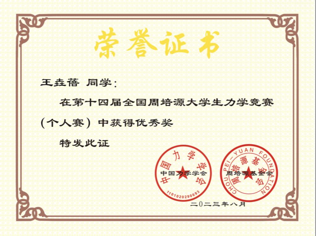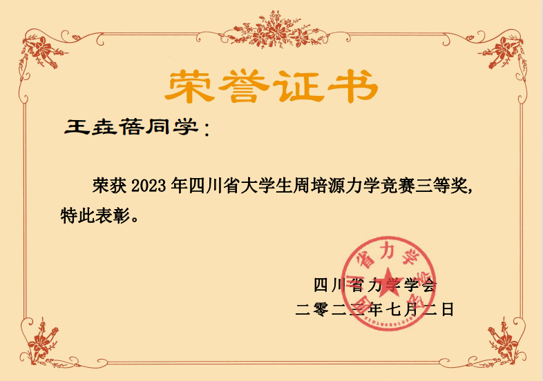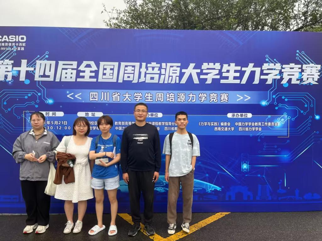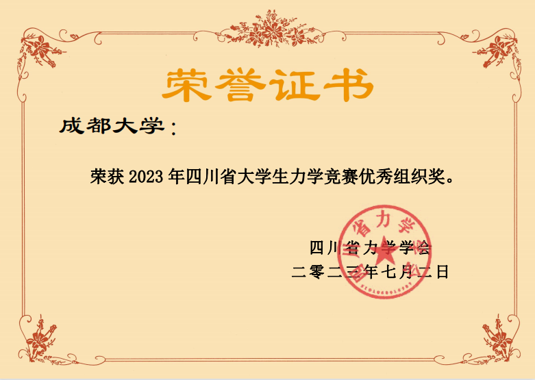 2023年第十四届全国周培源大学生力学竞赛四川赛区比赛于5月21日在西南交通大学犀浦校区举行。我校学子积极参赛、认真备考,在参赛学生和指导老师(侯杰、蔡萌琦、傅林涛、杨柳、李力等)的共同努力下,在学院学校政策支持下,我校在该赛事取得历史性突破,我校土木系20级王垚蓓同学荣获2023年第十四届全国周培源大学生力学竞赛(个人赛)优秀奖、2023年四川省大学生周培源力学竞赛三等奖,成都大学获得四川省大学生周培源力学竞赛优秀组织奖。
