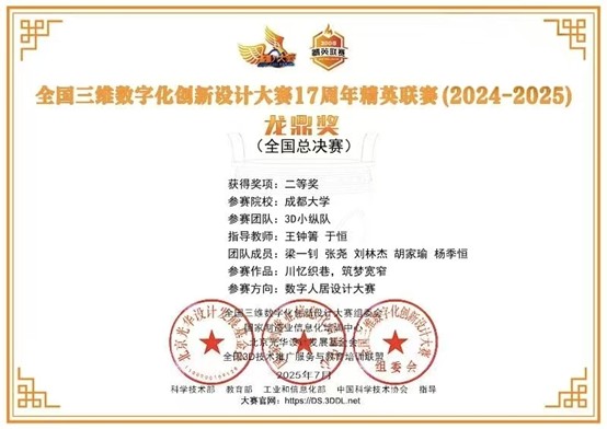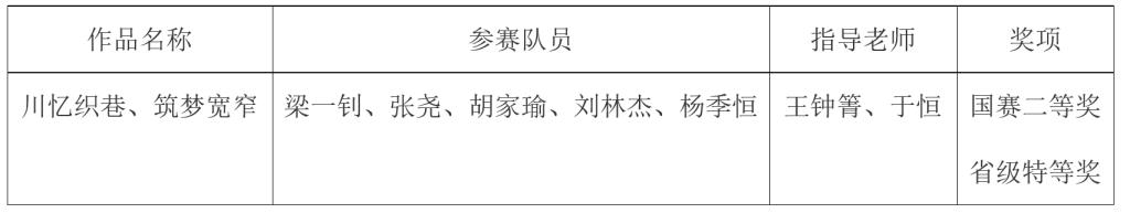 本科生“3D小纵队”(作品名称:川忆织巷、筑梦宽窄,成员:梁一钊、张尧、胡家瑜、刘林杰、杨季恒),在王钟箐、于恒老师的指导下,稳扎稳打,准备充分,发挥出色,最终获得全国二等奖的优异成绩。
